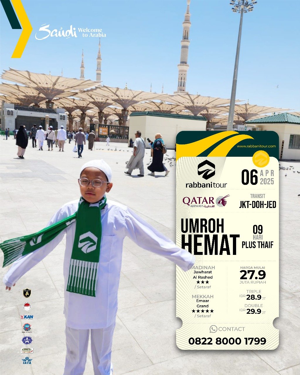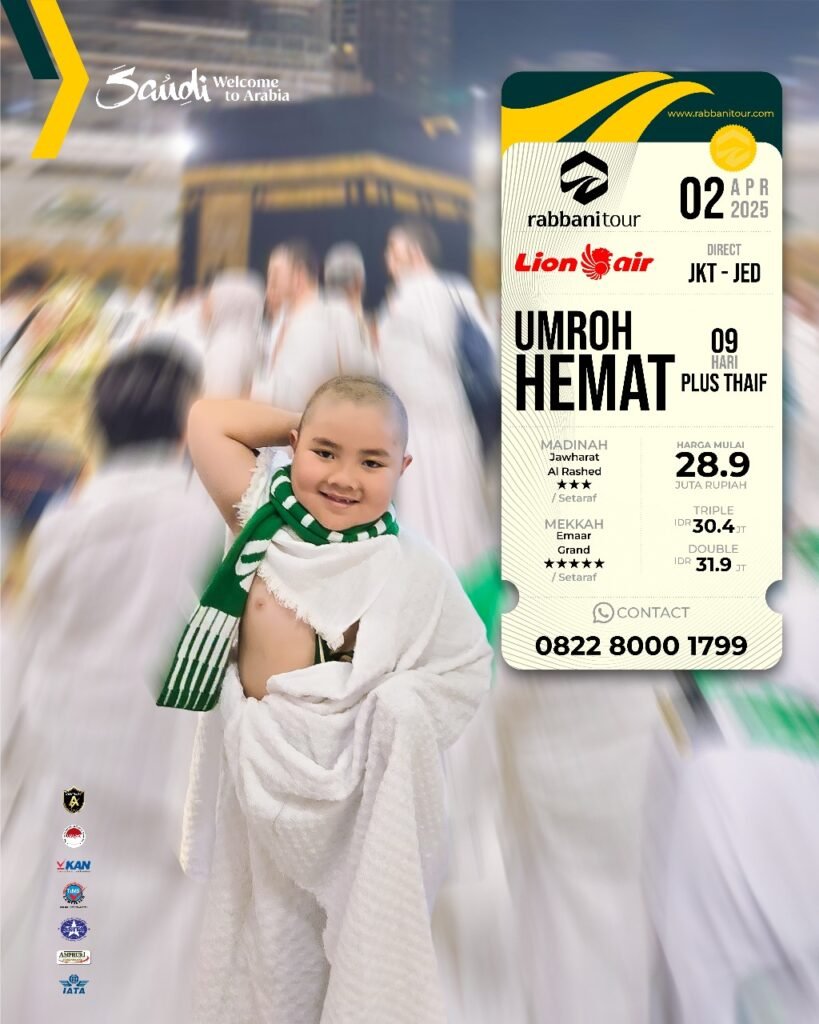 Rabbanitour menyediakan banyak pilihan tanggal keberangkatan dengan pilihan paket dan maskapai penerbangan untuk menjamin kenyamanan perjalanan umroh Anda dan keluarga.